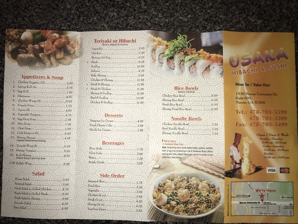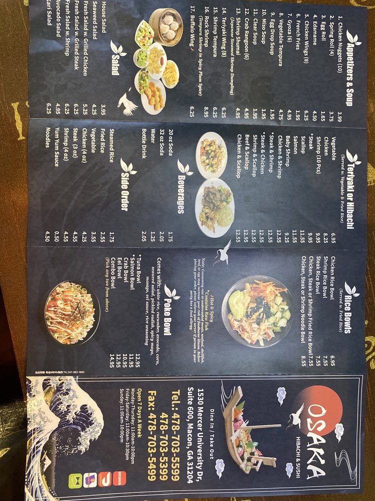Dessert enthusiasts will be pleased with options like the creamy Green Tea Cheese Cake and the indulgent Tempura Ice Cream, perfect for a sweet finish. Osaka also caters to a variety of dining preferences, whether you choose to dine in, takeout, or order delivery. Guests rave about the generous portions and quality of food, highlighting standout items such as the loaded crab Rangoon. Despite some service hiccups, the culinary experience remains the star of the show. Don’t miss their mouthwatering sushi rolls and inviting atmosphere!